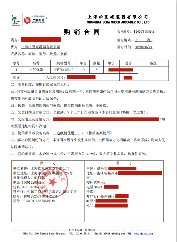 【造紙機(jī)配套】上海松夏空氣彈簧合同介紹:
